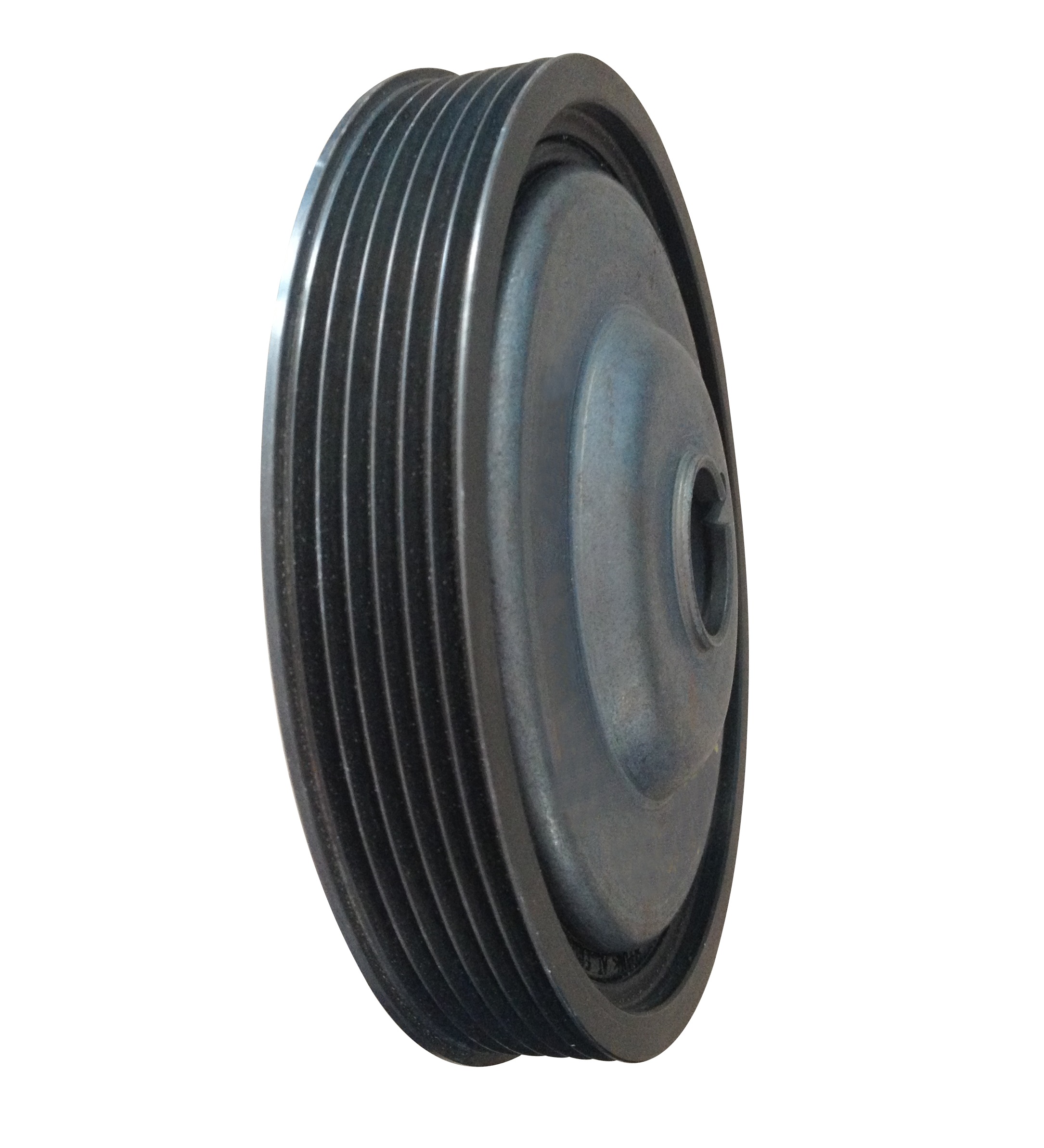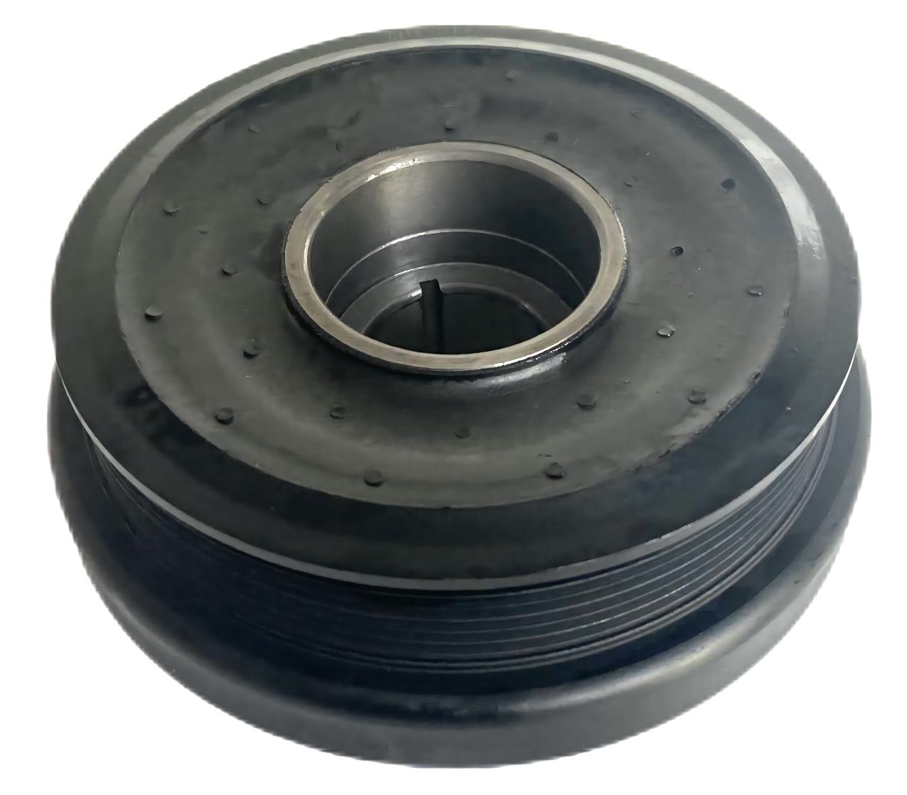 曲軸減震皮帶輪,是發動機前端附件系統的重要零件之一,分為橡膠減震皮帶輪、硅油扭轉減震皮帶輪及橡膠硅油復合型扭轉減震皮帶輪,基本結構一般由輪轂、外圈、橡膠組成,大多安裝于曲軸的前端,傳遞曲軸輸出的扭矩以驅動輪系附件。